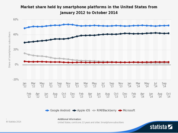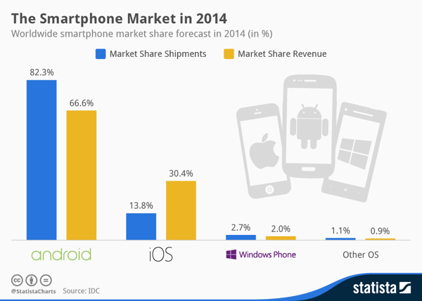 IDC recently published some statistics (below) that show Android is clearly “winning” in terms of the volume of smartphones shipped in 2014 with 82.3% of all handsets, and that it’s revenue share stands at an impressive 66.6%.