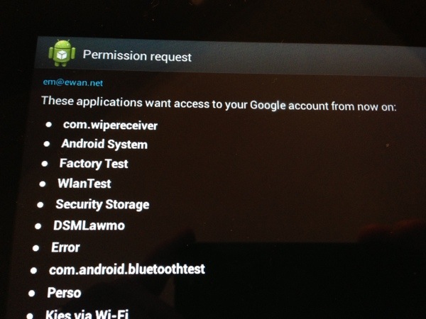 Seriously who is running this UI experience? Who is responsible for displaying this utter jibberish? I’m sure there’s a valid reason for “Factory Test” to require me to give access to my personal gmail account. So tell me why. Or better still, just make the decision for me. I don’t get this crap on Apple or on a BlackBerry Playbook.