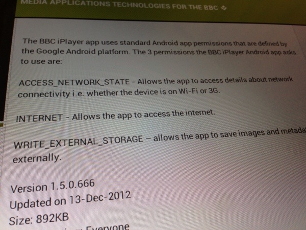That is the application description field for the BBC iPlayer App for Android. You have to feel for the developers who were forced to include explanations for the likes of “WRITE_EXTERNAL_STORAGE”.