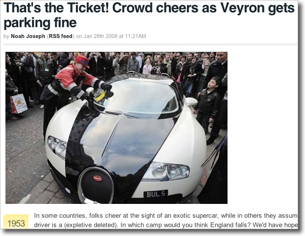 That is a traffic warden putting a parking ticket on the Bugatti. That is also a crowd cheering on the traffic warden. Why? Well it’s because each of the people watching will never, ever, ever have the capacity to even think about buying an £800,000 Bugatti. They know it. They know their place. Why should someone else be allowed to be successful enough to blow almost a million quid on a car? Yeah. Fluck’em! Rich B’stards!