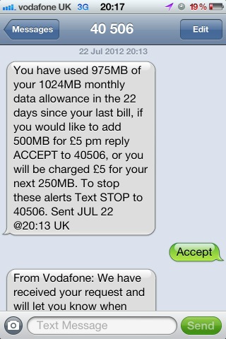 Ilicco then sent an ‘accept’ response to Vodafone asking to be charged £5 for 500mb.