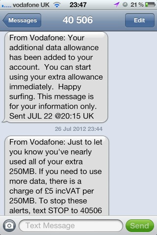 He’s a big data use, so he’s reaching his limit. Cue a nice helpful text for Ilicco from Vodafone — including a call to action.
