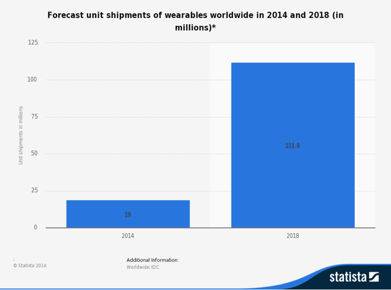 Globally, the estimated market size for wearables varies from anywhere between 19 and 27 million units. That equates to nearly $4.5 billion in revenue this year growing to over $50 billion by 2019.