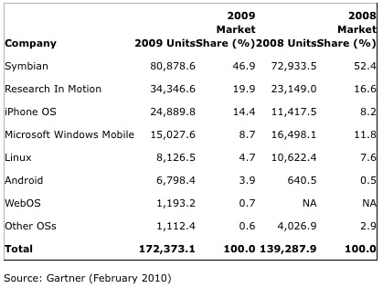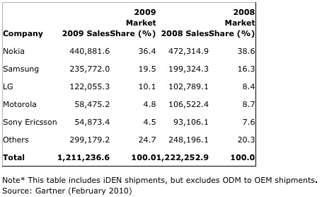 Gartner released their market research on worldwide smartphone sales today. Needless to say Nokia, is still the runaway market leader with a whopping 441 million devices sold, garnering a respectable 36.4%. But that’s down 2 percentage points over 2008. Samsung came next with 236 million devices sold, followed by LG (122m), Motorola (58m), Sony (55m) and then the rest (299m).