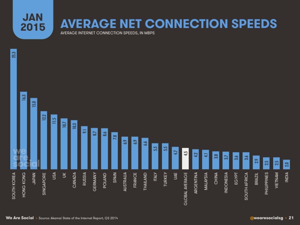 South Korea leads the average net speed ranking with an incredible 25.3 Mbps, followed by Hong Kong with 16.3%. The only other countries with average Internet speeds over 10 Mbps are Japan, Singapore, the USA, the UK and Canada. Once again, India comes in last place with just 2 Mbps.