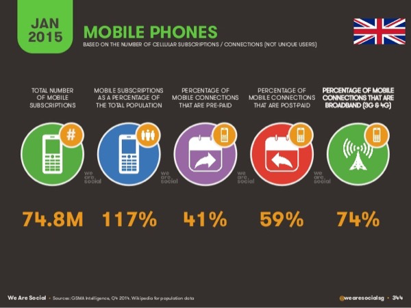 In the UK, there are now almost 75 million mobile subscriptions (117% of the population), split 41%/59% between pre-paid and post-paid.