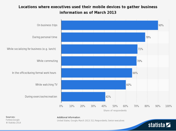 The following chart courtesy of Statista demonstrates that executives are already using their mobiles for business in almost every situation, so it’s not such a leap of the imagination to consider just leaving the laptop at home.