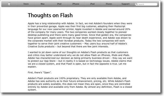 Many will be reading Jobs’ note and agreeing with his smartly argued sentiments. What iFan, previously quite content with Adobe and Flash, could fail to agree with the following statement from Jobs?