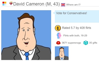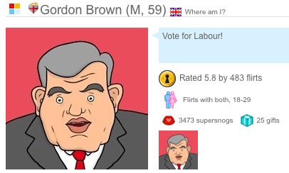 As all of Flirto’s users are 18+ and they’re fairly evenly spread across the country, it could well represent a reasonable youth demographic. Since April 30th, Flirtomatic have been running three different user profiles for each of the party leaders. The concept being that users ‘vote’ for each party by sending a ‘SuperSnogs’ to the relevant leader. If, for example, you are enamoured with Gordon Brown of the Labour Party, you would thus send him a snog, right? You can also ‘rate’ them out of 10.