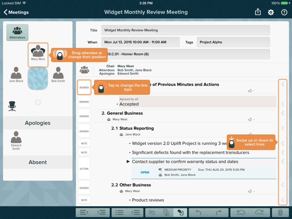 Imperative Software launched the free app last month, purpose-built for the recording of notes, agenda items, actions, remarks and more. It takes a fresh approach to representing and editing meeting notes – select content simply by swiping down the side of the page to move, copy, delete or indent using simple gestures. Attendees can also be visualised around a virtual table – a nice touch (and the table expands when more people are added).