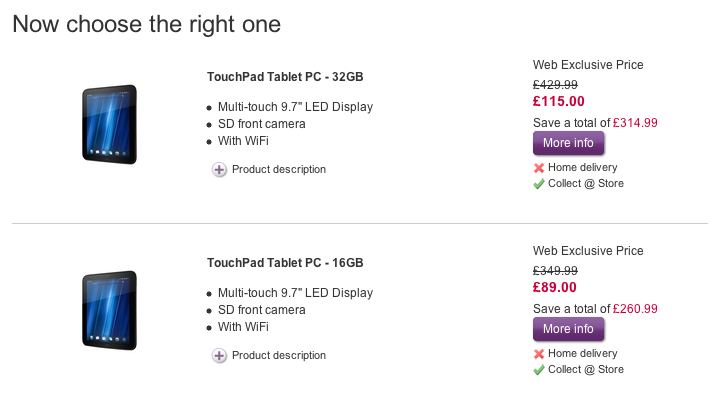 The neolithic incompetence of the HP board aside, here’s a quick primer: HP effectively announced the death of WebOS last week. Oh the OS may well be licensed. But hardware? No. Dead. If you own a Touchpad: Hahah. That was the message from HP last week. There were quite a few units sitting on shelves though. They needed to be cleared. Rather quickly over the weekend, rumours began flying of Touchpads being substantially discounted. News hit the UK on Monday evening, courtesy of a few tweets from the Dixons PR chaps. UK pricing has been ‘corrected’ (i.e. reduced-to-flog) at £89 for the 16GB Touchpad and £115 for the 32GB version.