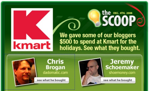 I’m rather impressed with the concept. The blogger gets $500 to spend and some good copy to write (“And then I bought..”) and the readers of the blogs get to sit and think about what they’d do with $500… and if they’re up for it, talk to Kmart, via Izea, and do their own post.