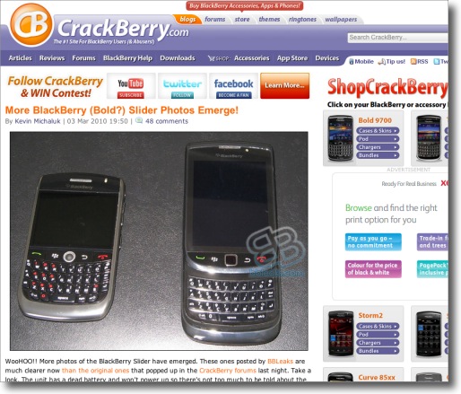I’m content to let nature take it’s course and for the Slider to be launched as and when RIM decide. I could be tempted. I absolutely adore the BlackBerry keyboard (although I was shocked, last night, to find I can type really fast with both thumbs on an iPhone 3GS). The Slider configuration would give a heck of a lot more screen real estate on the BlackBerry — and I’m a fan of that. Although I’ve never taken to the Storm(s), I always loved the amount of data you could pack into their giant screens.