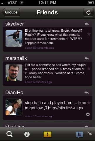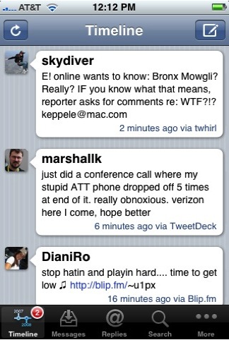Back at the launch in July, I initially tried out Twitterrific but was turned off by the ads and the associated cost of the Premium version if I didn’t want to see these ads. I was also turned off by Twinkle because it was more than a Twitter service, and you had to register with Tapulous to use it (who needs one more thing to register for?).