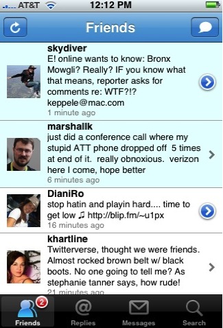 Which brings us to TwitterFon. Like Twittelator, it has both TwitPic support and location support. And like Tweetsville, it has a clean, white layout. Also like Tweetsville, it has an indicator of how many tweets that have elapsed since you last used it. But it raises the stakes in this area even higher. The new tweets are also highlighted in blue to make it easy to see what you need to read. TwitterFon also doesn’t have the severe lag time that Tweetsville does when it’s loading a lot of tweets.