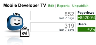 I published Mobile Industry Review’s app a while ago and I’m delighted that it’s still getting a lot of use. Indeed, in the last 7 days, it’s had 104 users and 419 page views. I decided to create a dedicated Mobile Developer TV app with the wizard … because I can. And because it’s toooooo easy. I think I created it in about 5 minutes flat.