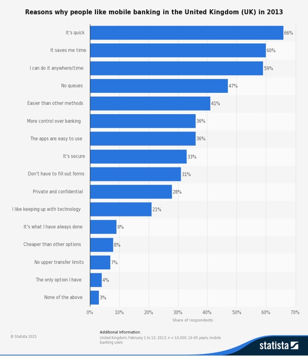 Just why have Britons taken to mobile banking so readily? The main reason is undoubtedly the convenience – it’s quick, saves time, it can be done anywhere and there are no queues. It’s no coincidence those were the top answers in a 2013 poll by Statista, which found that 66% of respondents stated “it’s quick” and 60% said “it saves me time”.