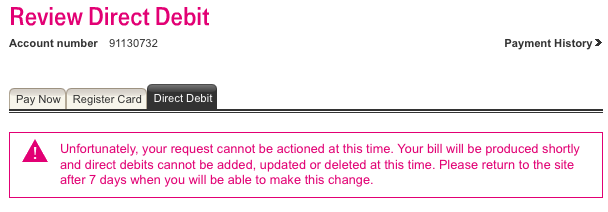 Unfortunately, your request cannot be actioned at this time. Your bill will be produced shortly and direct debits cannot be added, updated or deleted at this time. Please return to the site after 7 days when you will be able to make this change.