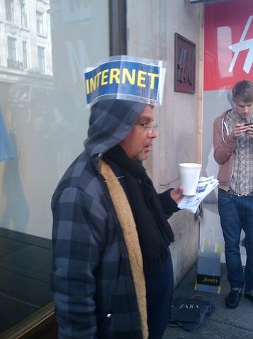 Why the chap pictured is walking about with an ‘internet’ sign on his head, I do not know.