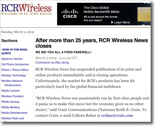 “RCR Wireless News was passionately run by first-class people and it pains us to make this move but the economy gives us no other choice,” said Crain Communications Chairman Keith E. Crain. To contact Crain, e-mail Colleen Robar at crobar@crain.com