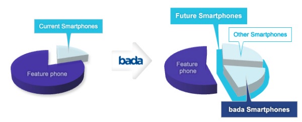 Interestingly, Samsung aren’t aiming to compete directly with the existing smartphone platforms. Instead, they’re aiming to enlarge the existing market, moving feature phone users to smartphone users. I like the strategy, given that Samsung are one of the biggest manufacturers of phones we’d normally refer to as ‘feature’ class. One slide — which I’ll see if I can pick up — showed a pie chart with the 15-20% chunk assigned to Smartphones, the rest feature phones. The Samsung chap then modified the pie chart to show the smartphone segment enlarging to perhaps 40% — indicating where Samsung intends attracting its customer base from.