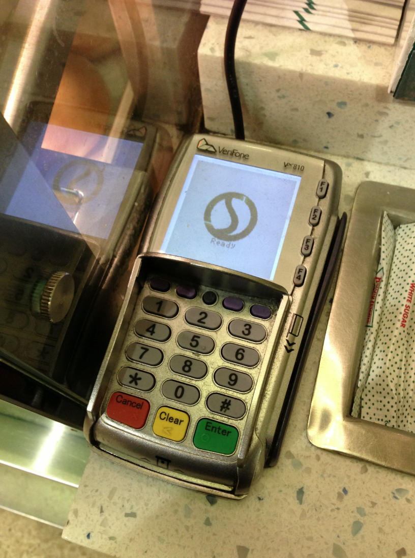 I took a picture of the machine. You’ll no doubt recognise the make. It’s one of those ageing VeriFone models.