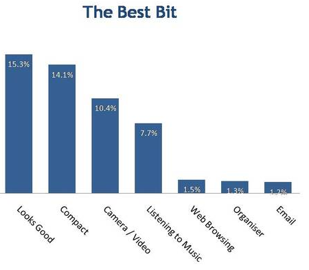 15.3% demonstrates that above all, UK purchasers want a handset that looks good. It’s a fashion item. A measly amount want email — only 1.2%. That’s to be expected though when you talk to normobs. I’m not surprised that only 1.5% rated the web browsing experience of their handset as the best bit.