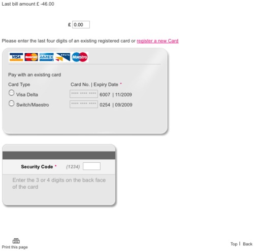 You select your card number and then enter your security code… then… go nowhere. Because the PAY button doesn’t exist on this page, tonight, for some INANE reason.