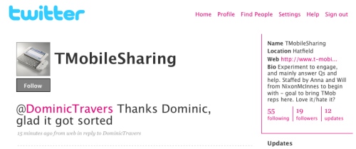 If you’d like to follow T-Mobile UK on Twitter — you can — SHOCK HORROR. The username you want is TMobileSharing.