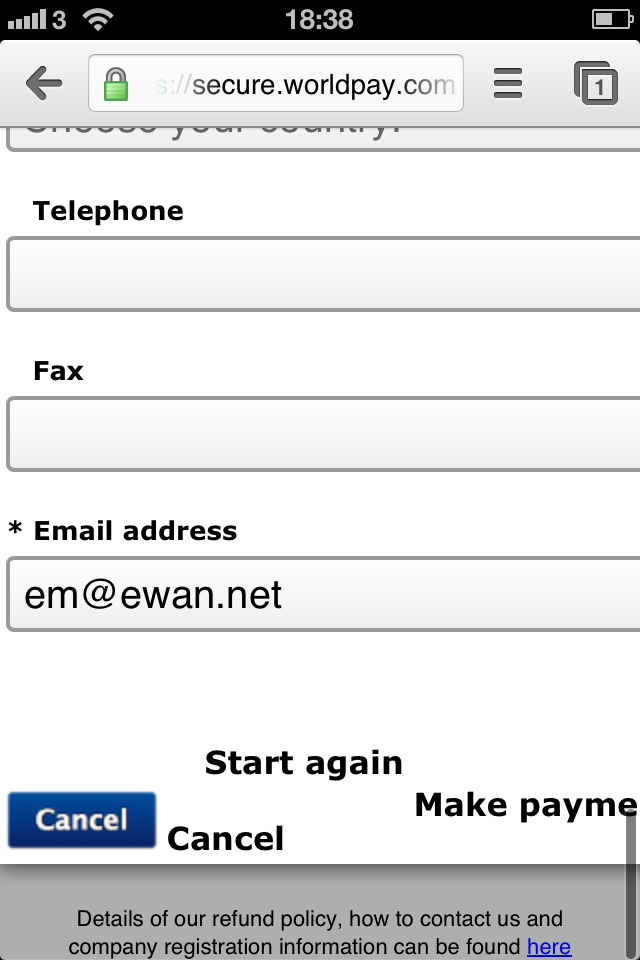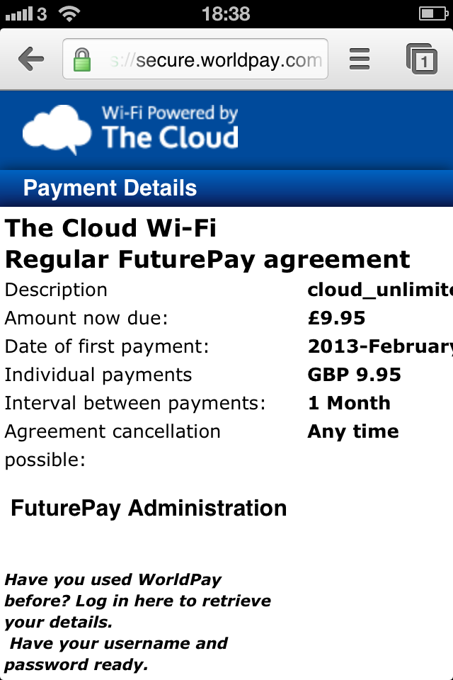Hardly friendly. Indeed it confirms the price twice. And it doesn’t fit on the phone’s screen. Every other part of The Cloud’s user experience fits beautifully on the phone. Except when they throw their users over to their payment gateway.