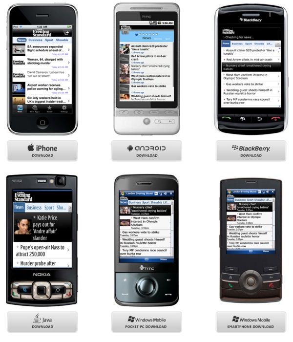 The London Evening Standard today has officially launched it’s mobile applications — finally. We’ve been waiting for quite some time, indeed it’s always been a source of annoyance that I can’t easily ‘get’ the Evening Standard output on my mobile phone. Instead I usually end up grabbing a physical copy — ultra inefficient from a technical perspective.