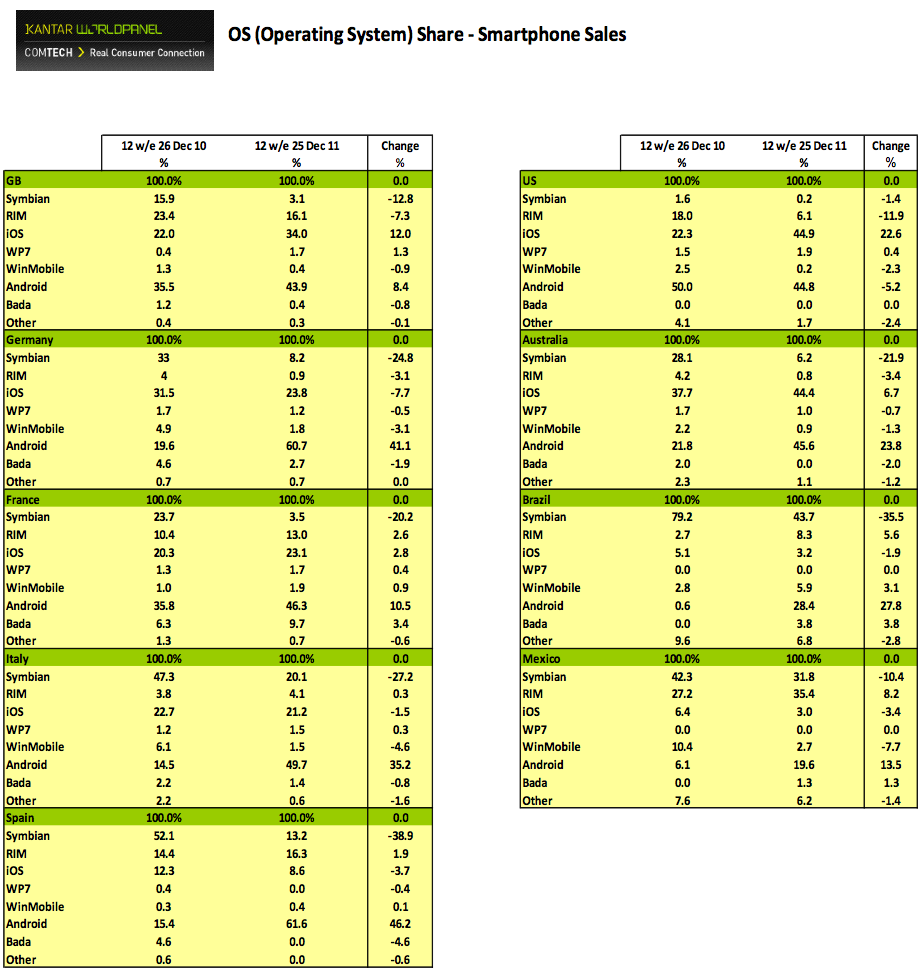 Windows 7 is yet to break past a 2% share in any country despite the media attention gained by the new Nokia Lumia range. The Nokia Lumia 800 finished quarter four just outside of the top 10 smartphones sold in Great Britain.