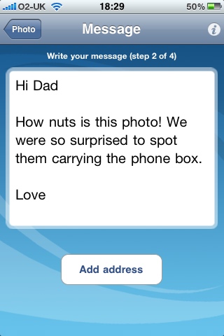 My only concern? It’s £1.49 per postcard, plus postage — making the total cost per card of £1.99. Buy 25+ and that reduces to a much more reasonable £0.99 per card, plus £0.45 UK postage. I’d love for them to find a way to deliver the service free. Or for a nominal £0.25 per delivery.