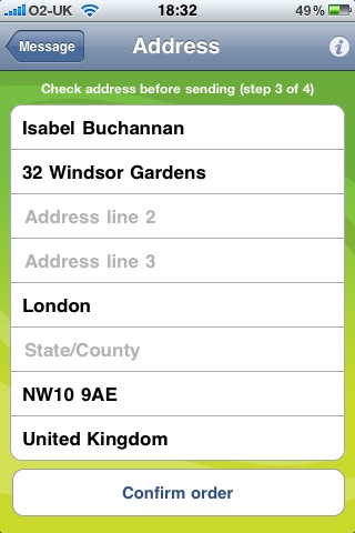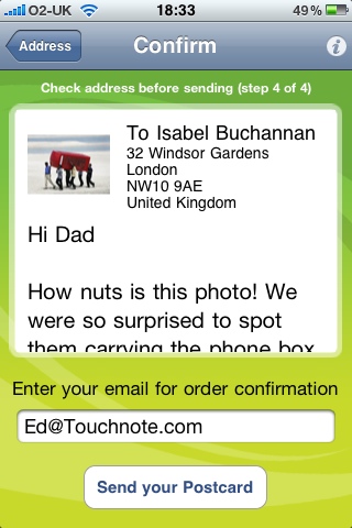 The use case is simply wonderful. Take a photo on your iPhone 3GS. Load Touchnote. Type in a message. Select the recipient’s physical address from your address book. Press Send. Done.