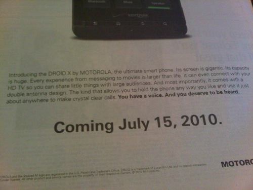 This is the back of today’s USA Today newspaper. As you can see, the advertisement is showing off the all new Droid X Android handset launching on Verizon on 15th July. Look really close at the blurb at the bottom. It reads: