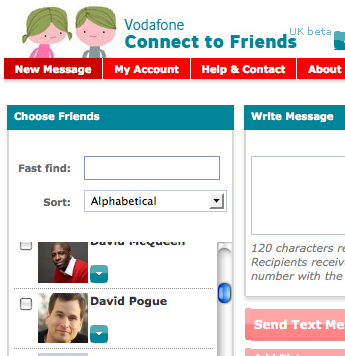 Stuart Dredge over at PocketPicks caught this and points out that it’s not just for Vodafone customers — anyone (I think, in the UK) can use it. You can buy credits from the system — the cheapest rate is 7p per text, giving you rather a good saving over the standard 12.5p rate most Vodafone customers pay out of bundle. Still quite steep. Particularly when you can send your friends a ‘free’ Facebook message.