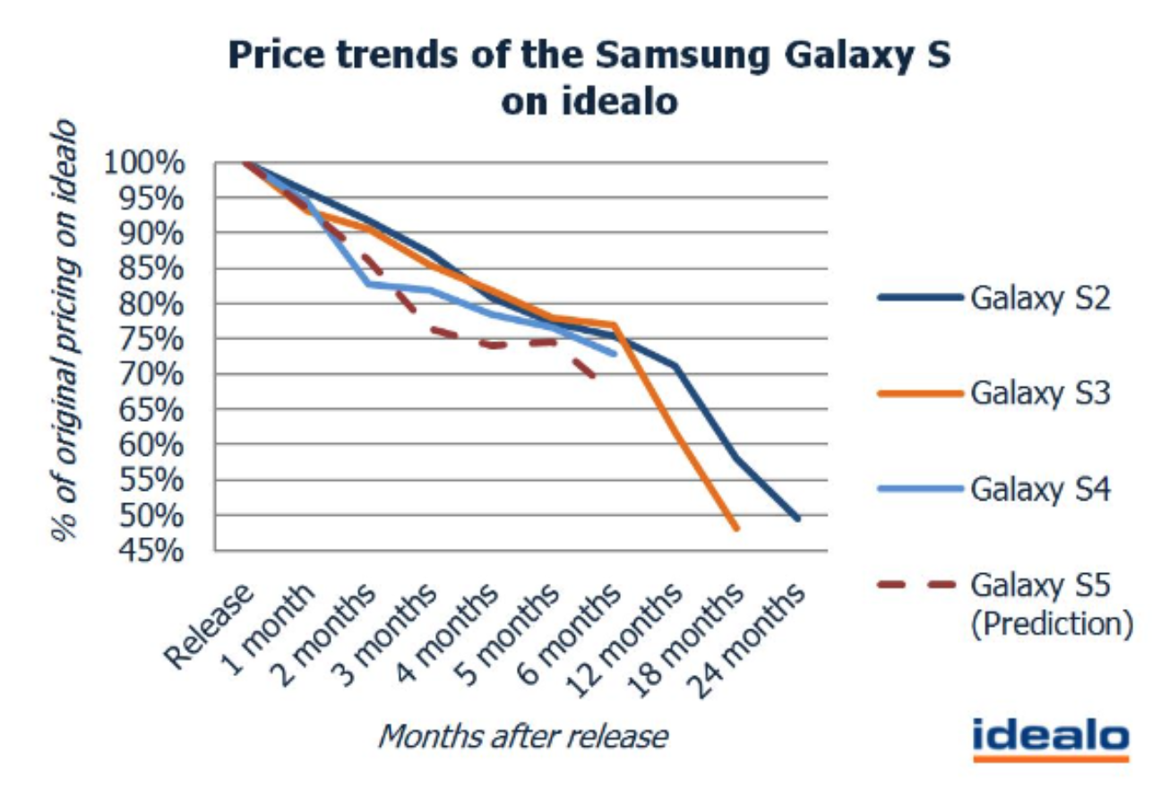 Actual new prices for the Galaxy S5 since launch have largely followed those predicted in Idealo’s chart above.